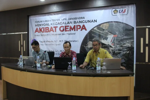Program Studi Teknik Sipil, Fakultas Teknik Universitas Janabadra Yogyakarta mengadakan Forum Ilmiah Teknik Sipil Janabadra, Bertajuk Menyoal Kegagalan Bangunan Akibat Gempa, pada 1 April 2025 bertempat di Ruang Eksekutif Kampus Pusat Universitas Janabadra Yogyakarta. Acara ini dimoderatori oleh Teguh Widodo, S.T., M.T., yang sekaligus menjadi narasumber bersama Prasetya Adi, S.T., M.T., Arusmalem Ginting, S.T., M.T., serta Dr.Eng. Mahmud Kori Effendi, S.T., M.T.