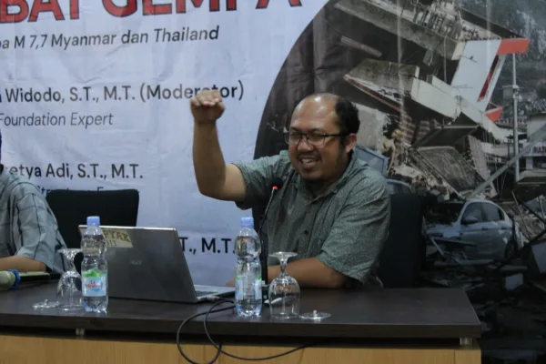 Beliau juga menyampaikan bahwa acara bertajuk “Menyoal Kegagalan Bangunan Akibat Gempa dengan menyorot pada Kasus Gempa 7,7 SR di Myanmar dan Thailand” merupakan wadah yang sangat relevan untuk menggali pengetahuan, berbagi pengalaman, dan memperkuat kolaborasi antar akademisi, praktisi, serta mahasiswa dalam bidang keteknikan dan mitigasi bencana, khususnya Teknik Sipil.